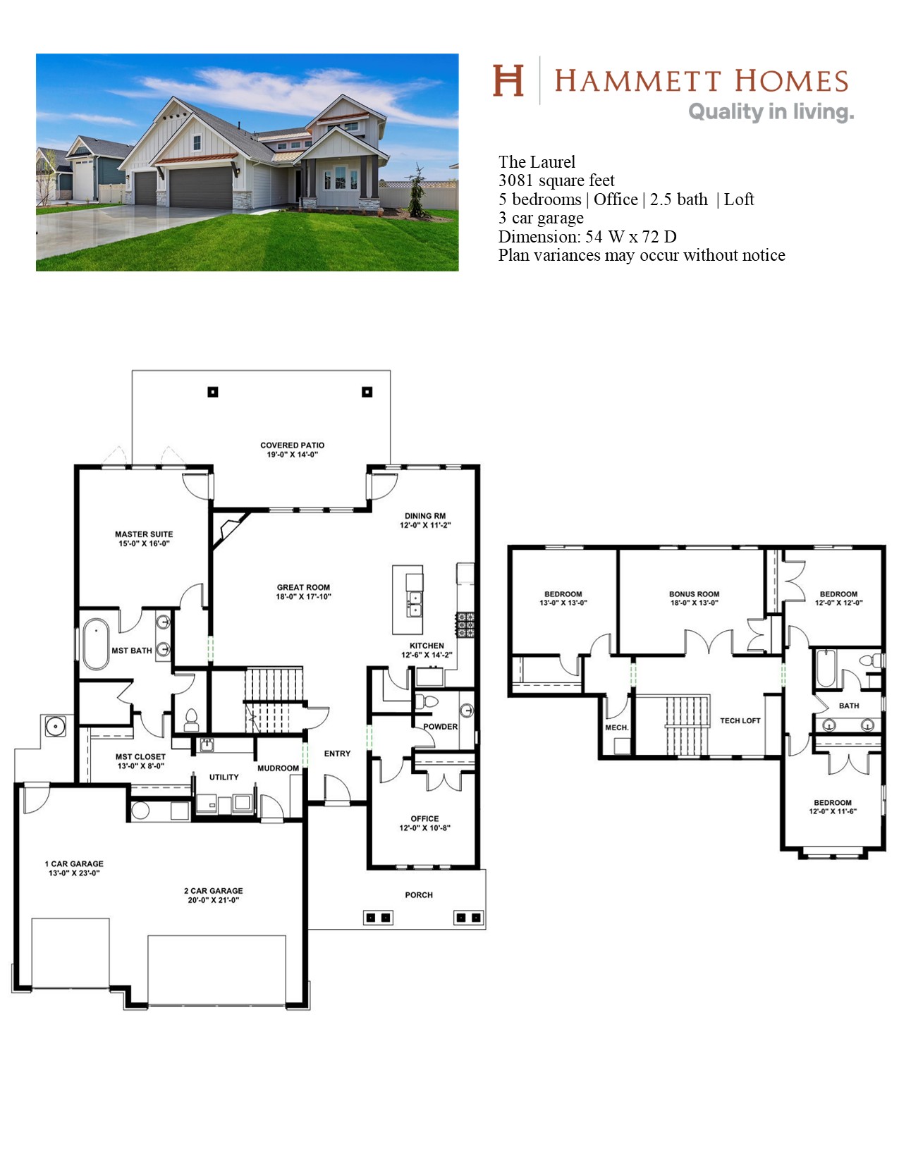 Hammett Homes presents the Laurel. This home boasts size and will have plenty of room for family to live, play and grow. The Laurel features a main level master with a large master suite and walk through closet directly into the laundry room. The kitchen, dining and great room are open for entertaining and spending time together. There is a dedicated office downstairs. The upstairs offers 3 bedrooms, a bonus room plus a large loft for additional work space.