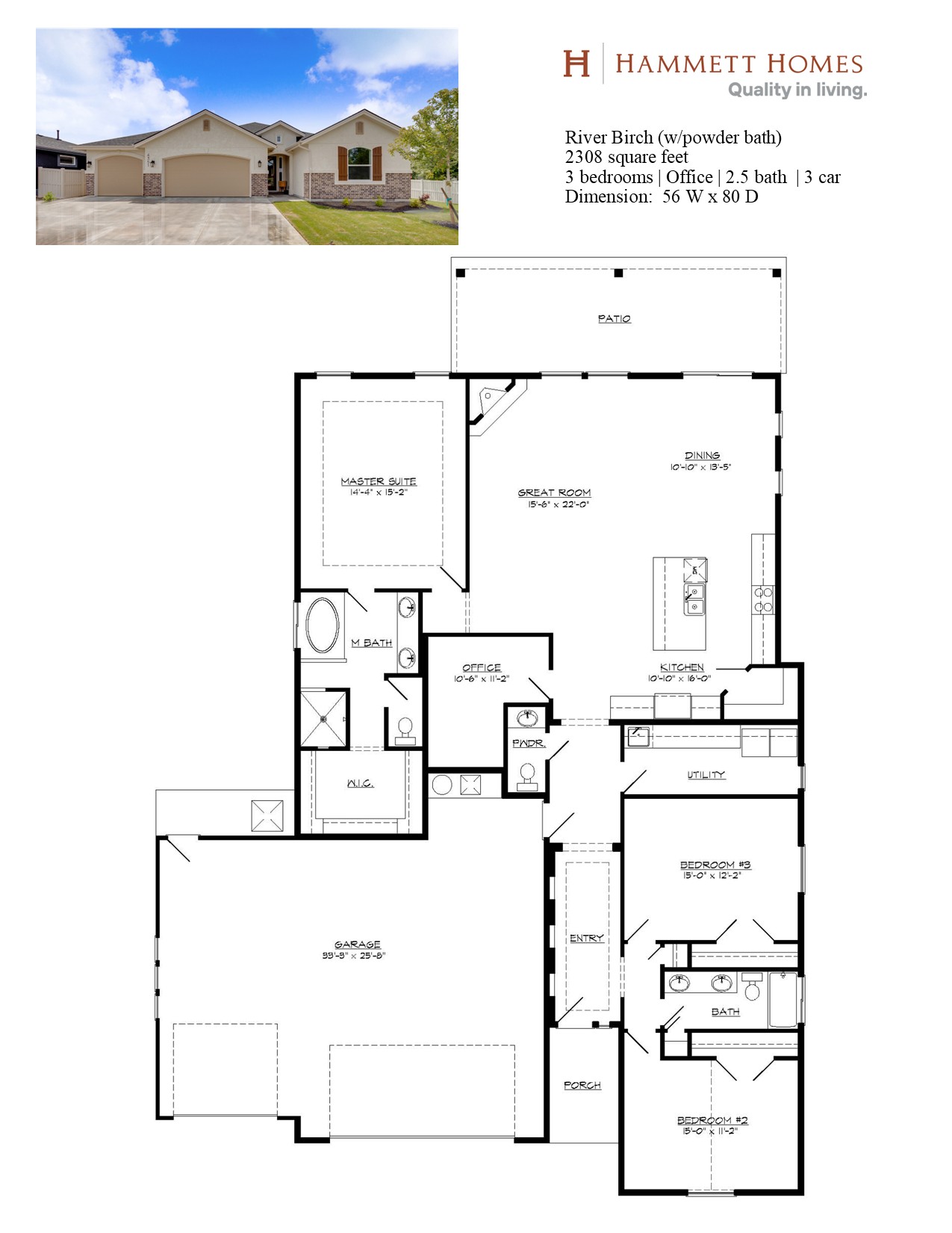 Hammett Homes present The River Birch. This popular single level has been revised to create even more space for living and entertaining. We have included larger bedrooms, a three car garage and a larger bonus room. This home has a large open kitchen, a large great room and two covered patios to relax on. Hammett Homes is proud to be "Building Foundations For Life".