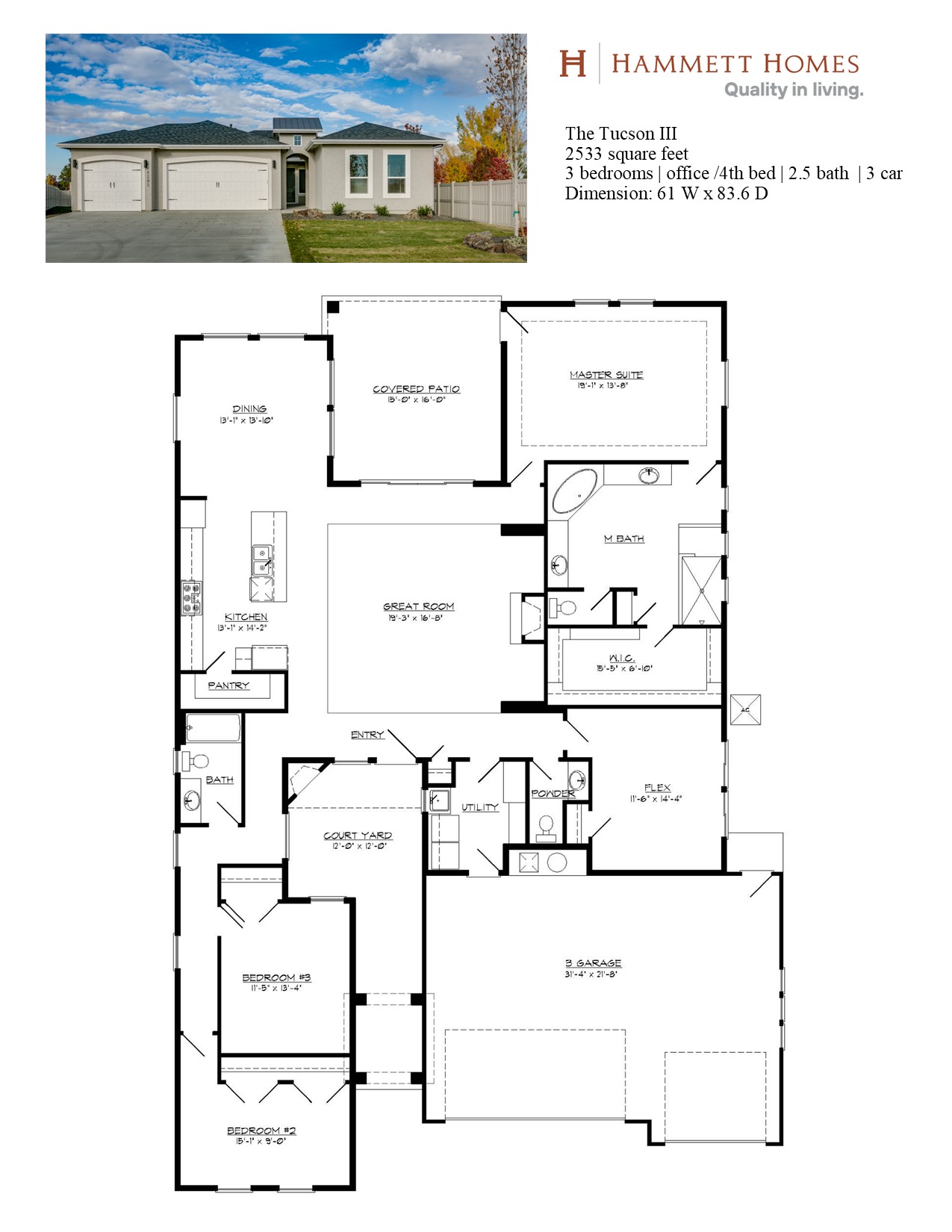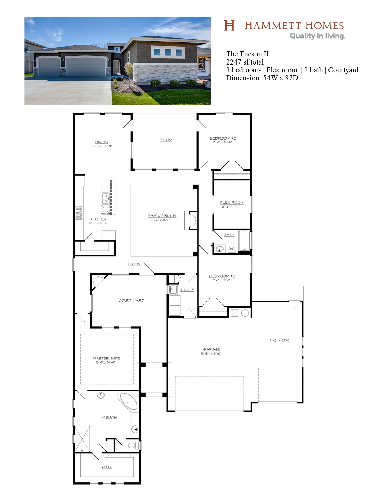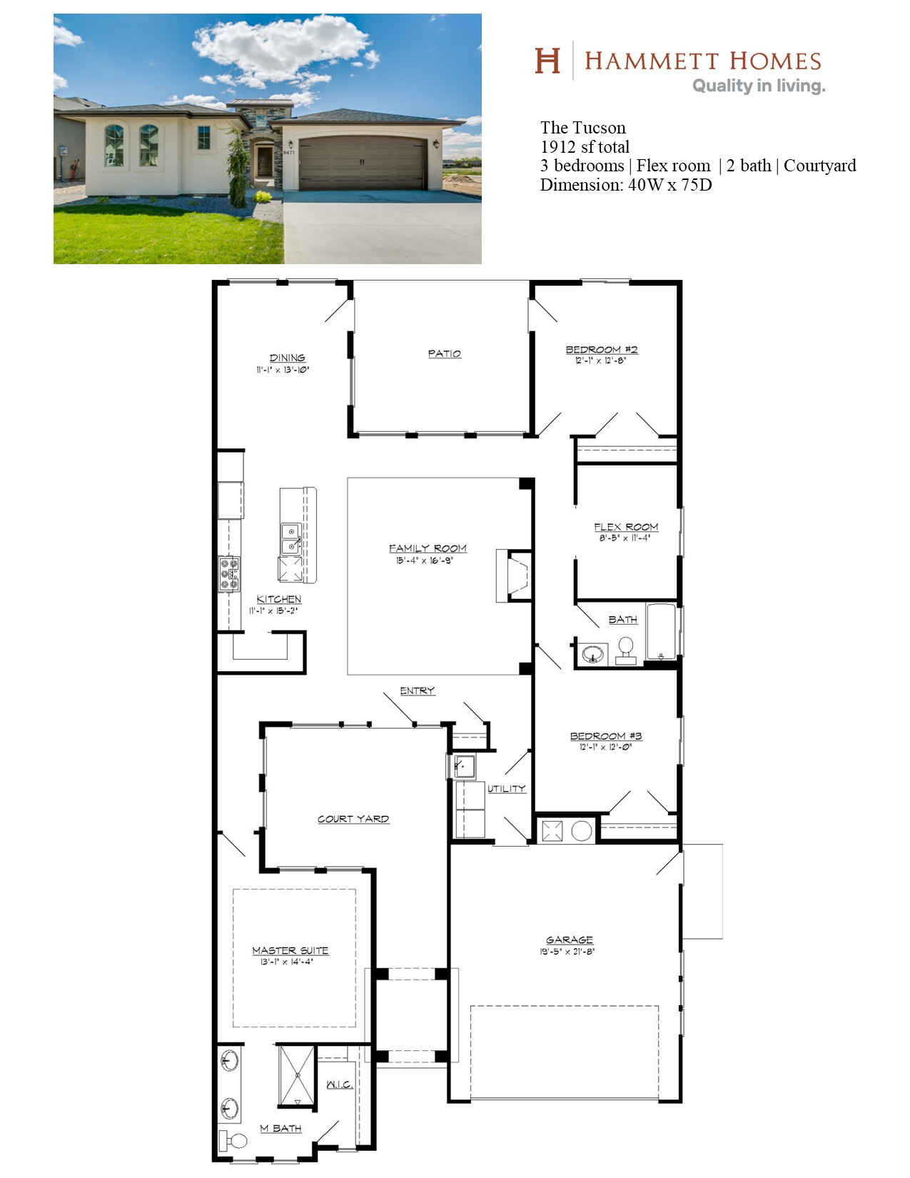 The Tuscon by Hammett Homes is a single level with interior courtyard to allow for ultimate privacy. The home features 3 bedrooms, a flex room, private entry courtyard and private covered back patio. The windows allow lots of natural light. The open great room and kitchen area are perfect for entertaining friends and family.