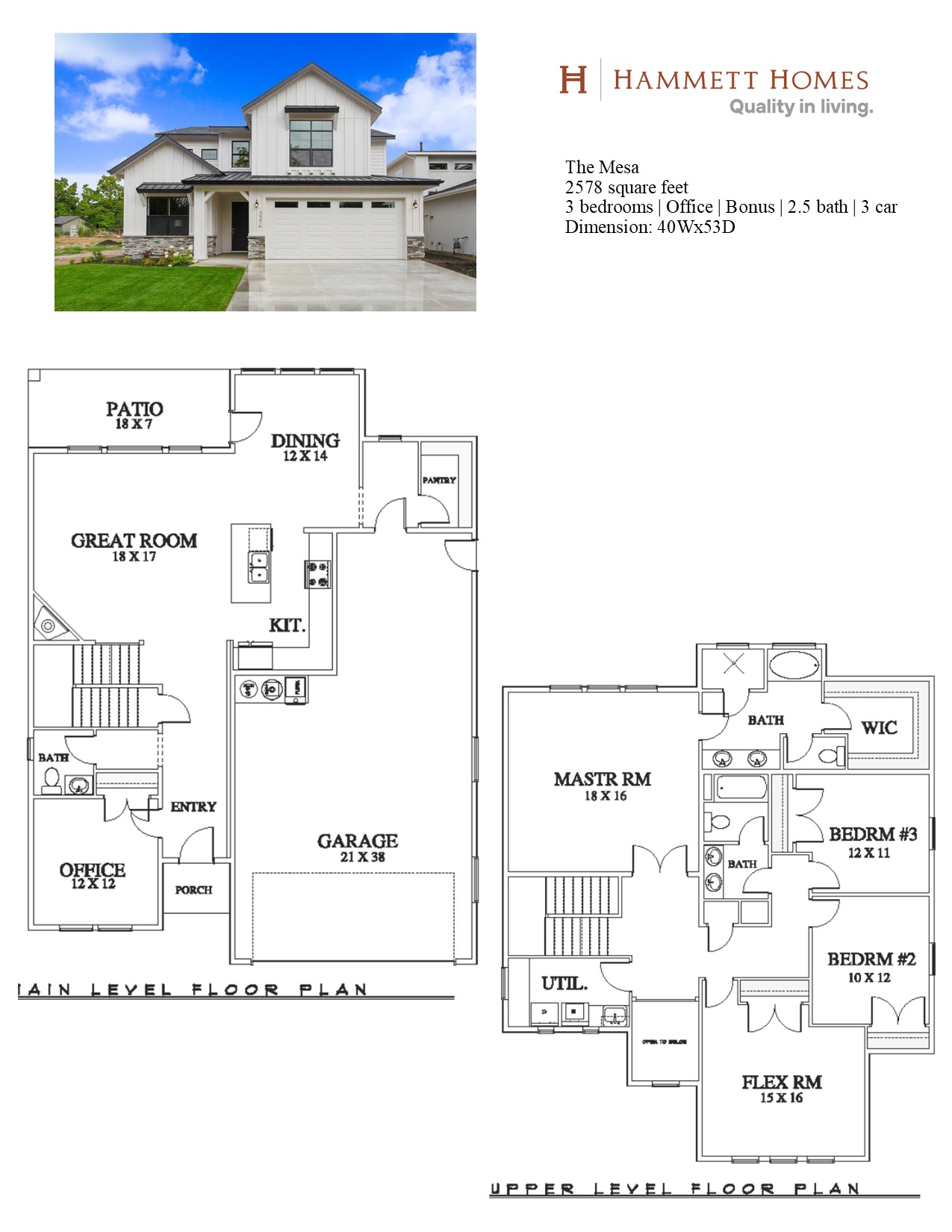 The Mesa by Hammett Homes is a spacious floor plan with lots of windows for natural light. The home features 4 bedrooms and an office. The master bath includes a large tile walk in shower and master closet. The master bedroom is very large. The kitchen, great room and dining room are all open and have beautiful finishes and includes Bosch appliances. The back patio is covered and spacious.