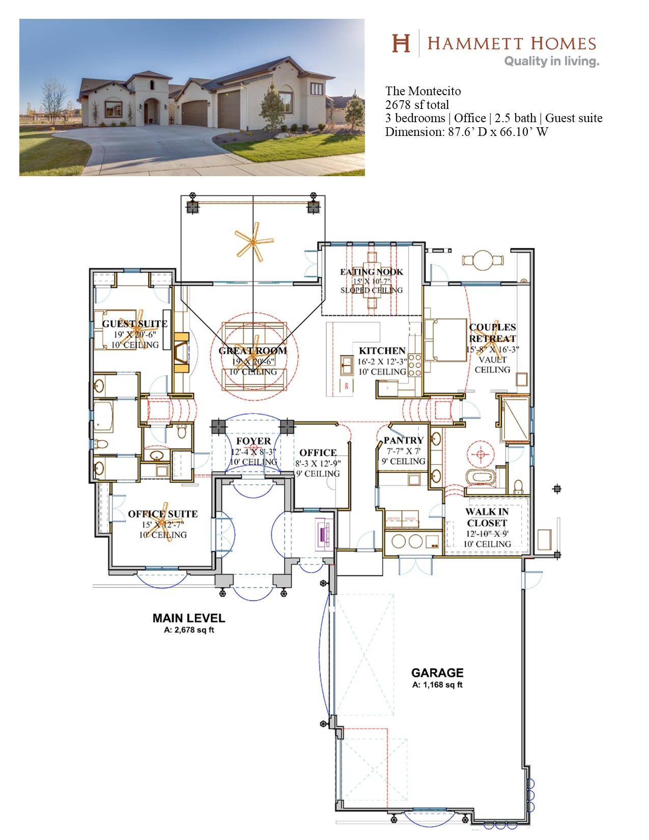 Hammett Homes presents The Montecito.This is a unique home with so many details! A very spacious great room for entertaining guests featuring a circular ceiling with LED lights.The kitchen is is large and offers a huge island. The eating space features a sloped ceiling and ceiling beams. The master suite is amazing including a small wet bar! Thre is so much more the Montecito offers including Hammett Homes signature back-lit floating mirrors.