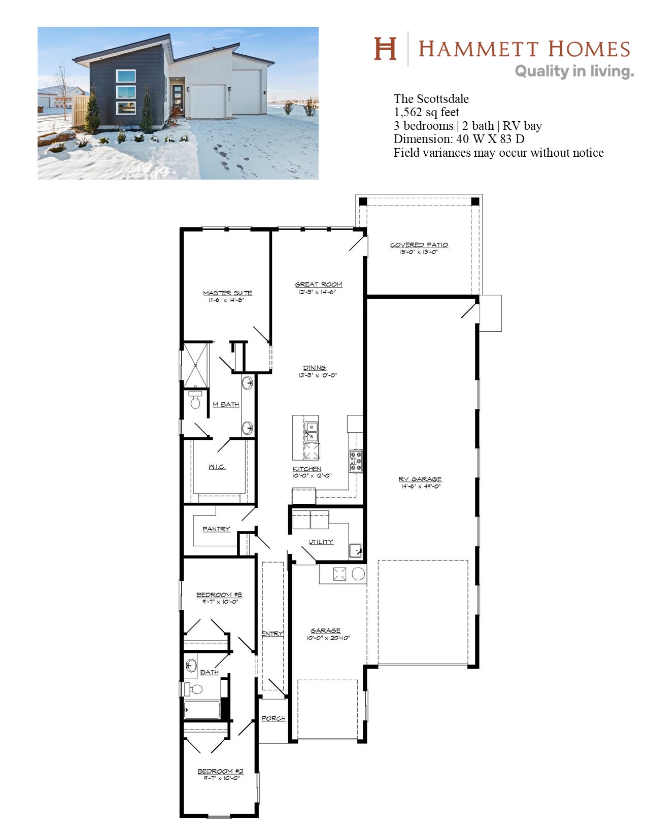 The Scottsdale is a single level that offers 3 bedrooms, 2 baths, large pantry, large private covered patio and a HUGE RV bay! The kitchen is spacious and features a Bosch appliance package with a 5 burner cooktop, double wall oven, microwave drawer and dishwasher. The secondary bedrooms are separated from the primary suite for extra privacy. The primary suite features a large walk in tile shower and large walk in closet. Then there is the large RV bay that is 49' long! The bathrooms feature Hammett Homes signature backlit floating mirrors.